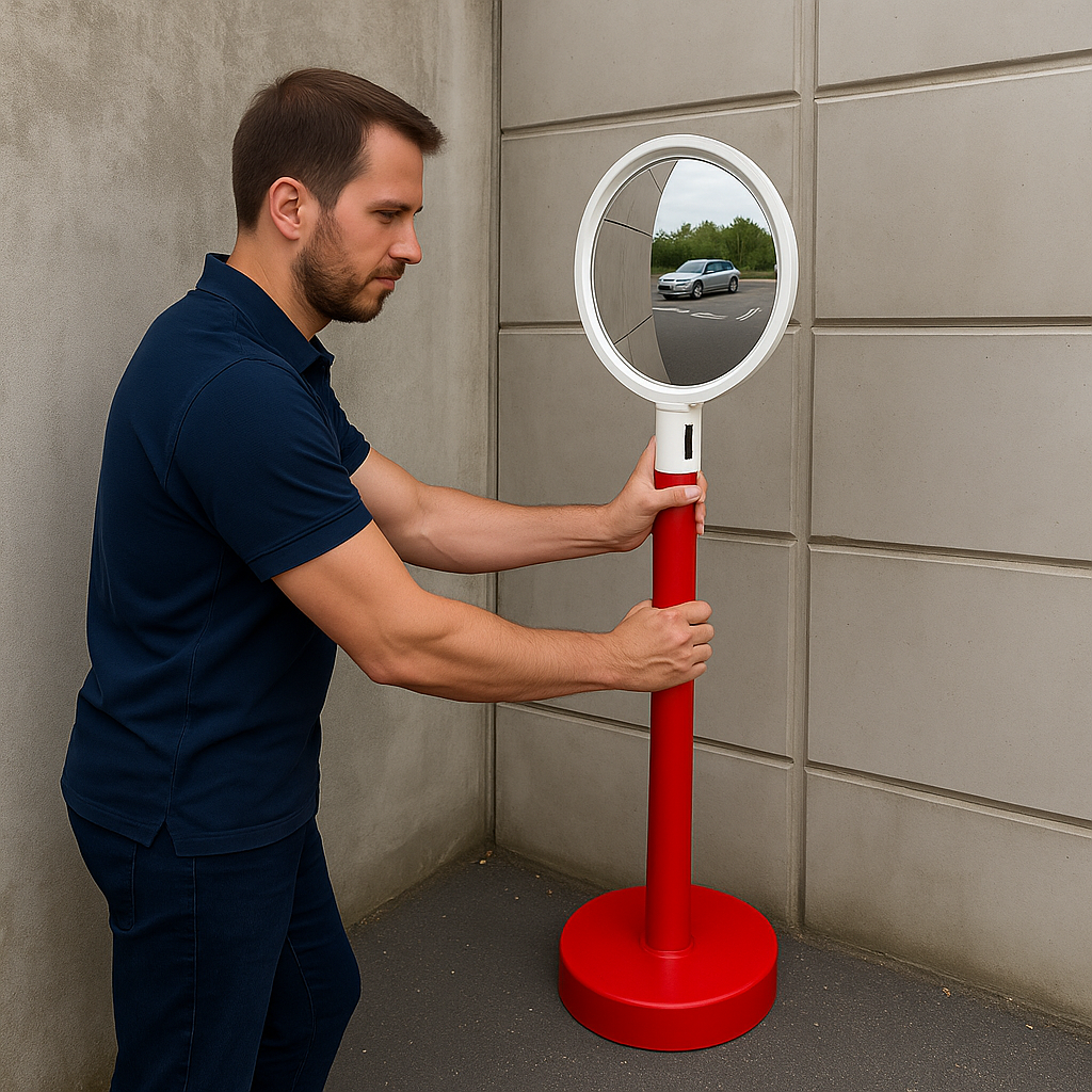 Acest stâlp de delimitare cu oglindă convexă inclusă oferă vizibilitate extinsă, control mai bun asupra circulației și siguranță sporită pentru șoferi, pietoni sau angajați.